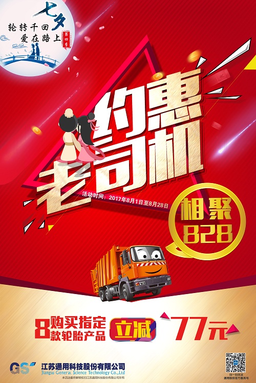 今年通用股份第四季七夕愛購月活動更是加大力度,從8月1日至8月28日,為期28天,約惠老司機、相聚828, 優惠普及風暴,席卷全國!凡購買通用股份“千里馬、赤兔馬、騏馬、通運、喜達通”五大品牌指定8款輪胎產品,立減77元,不忘初心,踐行以客戶為中心的承諾,各地經銷商們也因地制宜,貼心地為司機們準備了各種驚喜,路演所到之處,不僅匯聚了大規模的人流,還得到了老司機們的一致點贊。
