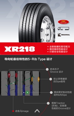 其中XR218采用全新耐磨抗剪切配方,更加穩定的操控性能設計,以及保障行駛安全性能設計。其導向輪采用了5—Rib Type設計,包括防夾石子Groove設計;防止異常磨損的Sipe使用;提供更好制動性能的Rib內Sipe;以及提高Traction(抓地)、防側滑性能的Groove設計。