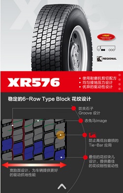 XR576使用耐磨抗剪切配方、均勻接地壓力設計以及優異的驅動性設計,寬胎面的設計為車輛提供更好的驅動抓地性能。同時采用更加穩定的6—Row Type Block花紋設計,包括防夾石子Groove 設計;赤兔馬Image;防止高低臺磨損的Tie—Bar應用。
